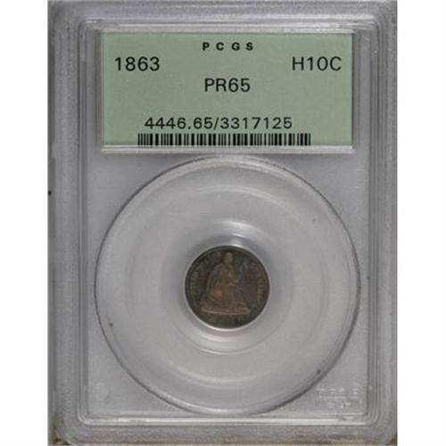 <B>1863 H10C PR65 PCGS.</B></I> This attractively toned Gem offers rich rose-orange and cerulean shadings on the obverse, while cooler violet and sapphire patina predominates on the reverse. Boldly struck and carefully preserved. Population: 33 in 65, 10 finer (1/08).<BR><BR><B>Coin Engraver:</B> Christian Gobrecht<BR><BR><b>Shipping:</b> Coins & Currency (<a target="_blank" href="http://www.heritageauctions.com/common/shipping.php">view shipping information</a>)