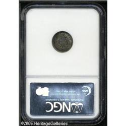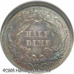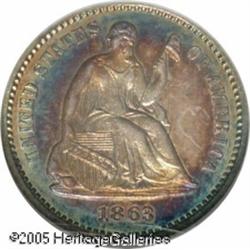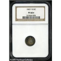 <B>1863 H10C PR66 <img border='0' src='http://www.heritagecoins.com/images/star.gif' width=10 height=10> NGC.</B></I> The dramatic eye appeal displayed by this diminutive Civil War era proof is ensured by vivid iridescent shades of burnt-gold, rose, and cobalt-blue. Survivors do tend to be well preserved, but few possess the pizzazz of this colorful specimen. Population: 11 in 66 (omitting the star designation), 3 finer (1/05). Lot:6163