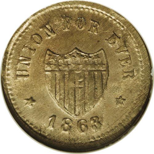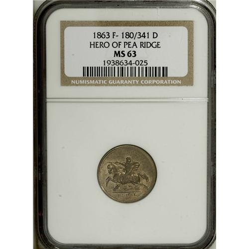 <B>1863 Hero of Pea Ridge/Union For Ever. Fuld 180/341D, R.9, MS63 NGC.</B></I> Copper-nickel. Very scarce listed combination, struck from an extremely worn die that has almost obliterated the legend above the horse rider. Close examination is recommended.<BR><BR><b>Shipping:</b> Coin/Currency (<a target="_blank" href="http://www.heritageauctions.com/common/shipping.php">view shipping information</a>)