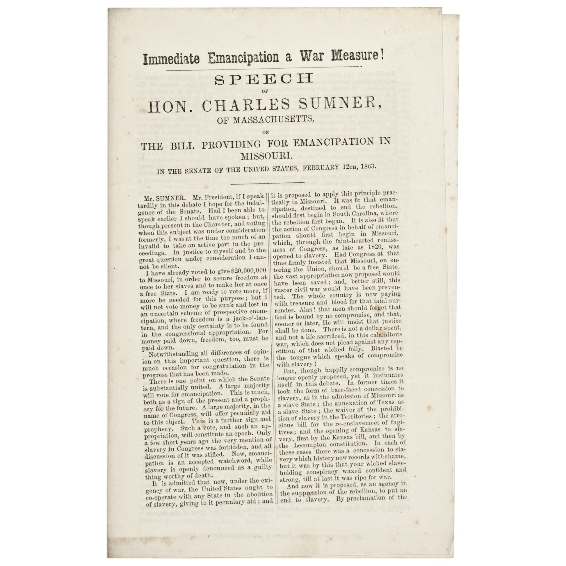 February 12, 1863-Dated Civil War Period, Anti-Slavery 4-page Imprint, "Immediate Emancipation a War Measure! SPEECH OF HON. CHARLES SUMNER," (1811-1874), Choice Very Fine.