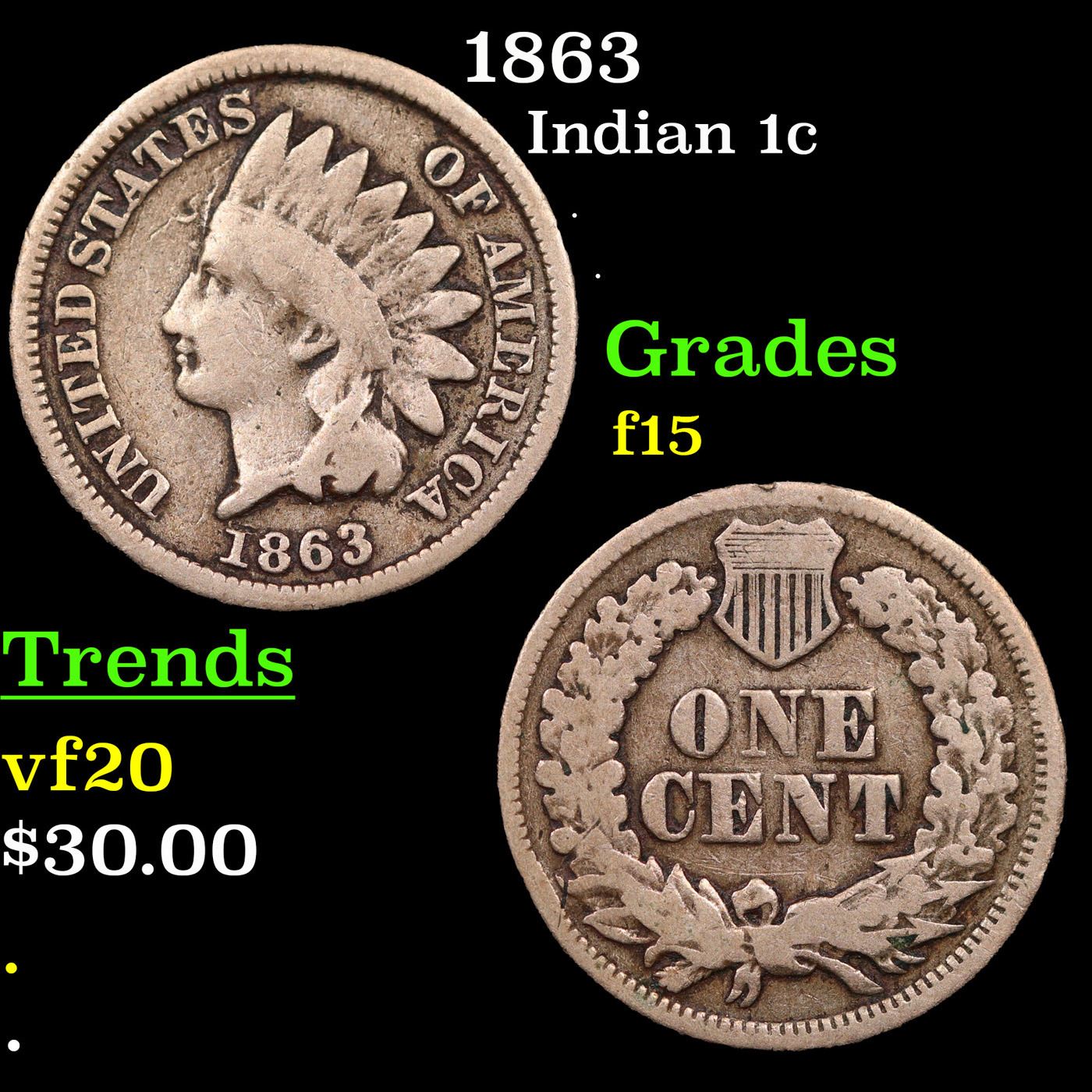 1863 Indian Cent 1c Grades f+.
