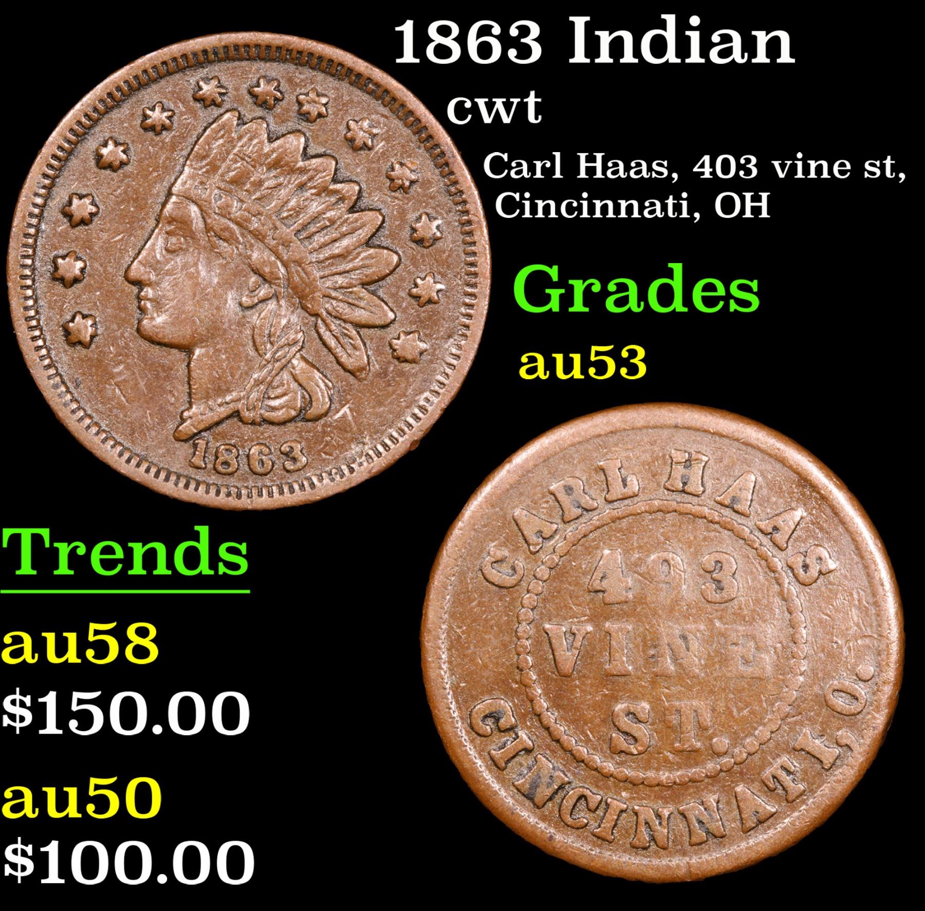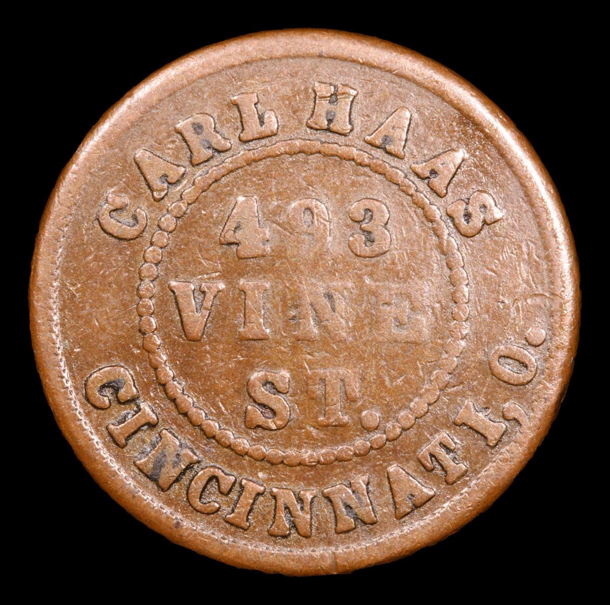 1863 Indian Carl Haas, 403 vine st, Cincinnati, OH . Civil War Token 1c Grades Select AU.