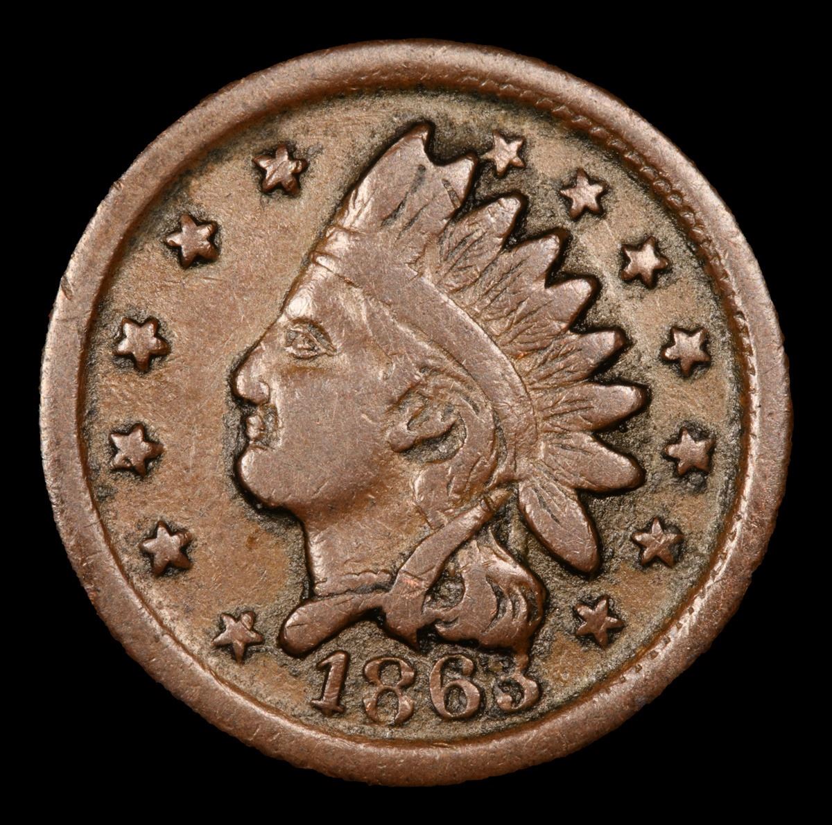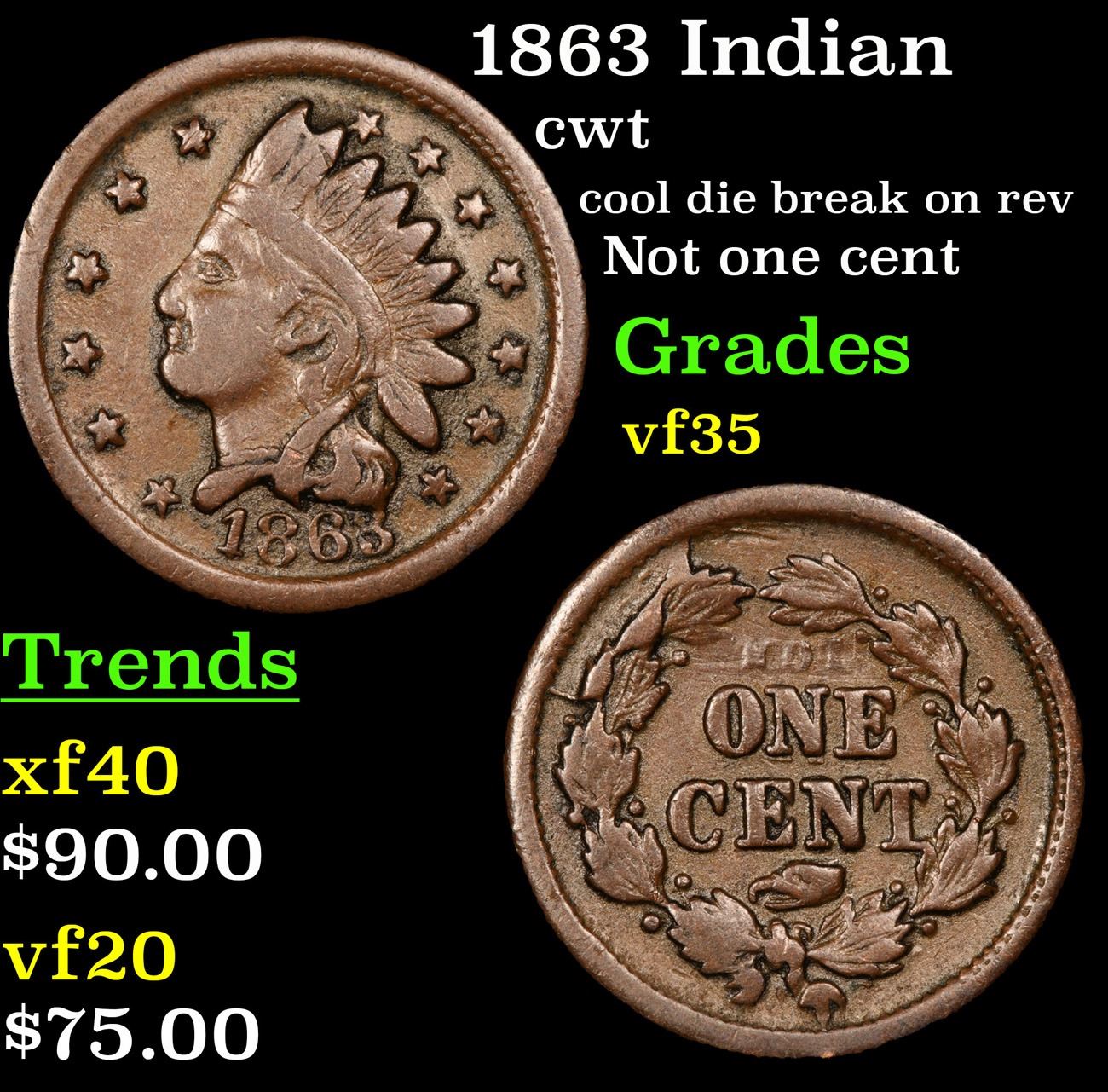 1863 Indian cool die break on rev Not one cent Civil War Token 1c Grades vf++.