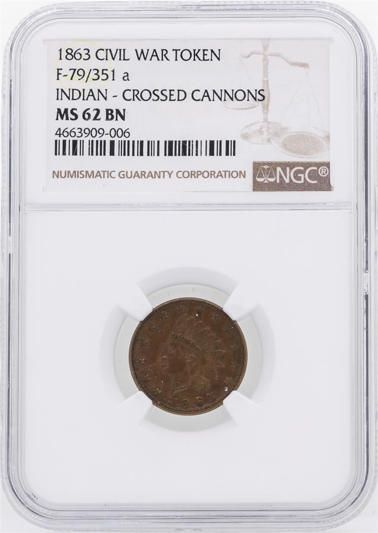 One 1863 Indian-Crossed Cannons Civil War Token NGC MS62BN. NGC Certified.