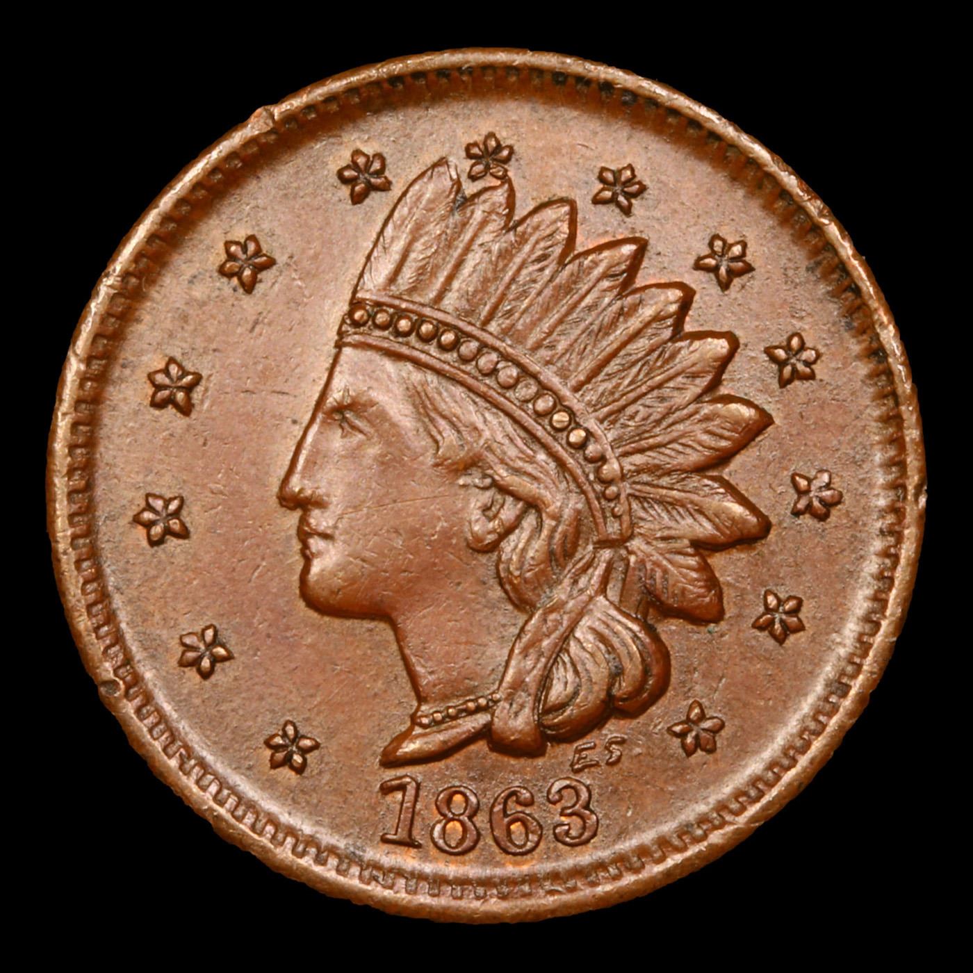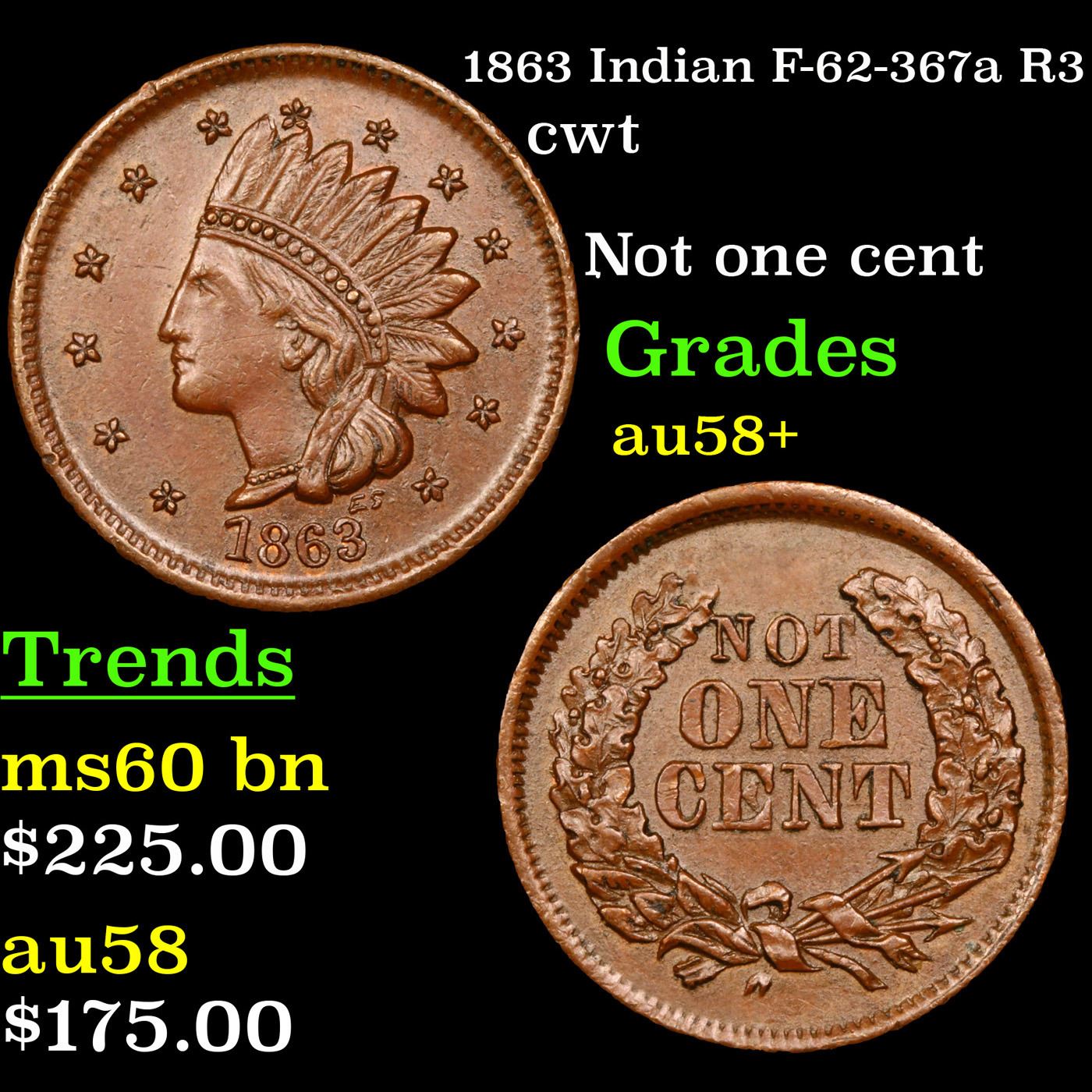 1863 Indian F-62-367a R3 Civil War Token 1c Grades Choice AU/BU Slider+. Obverse-Indian Reverse-Not one cent