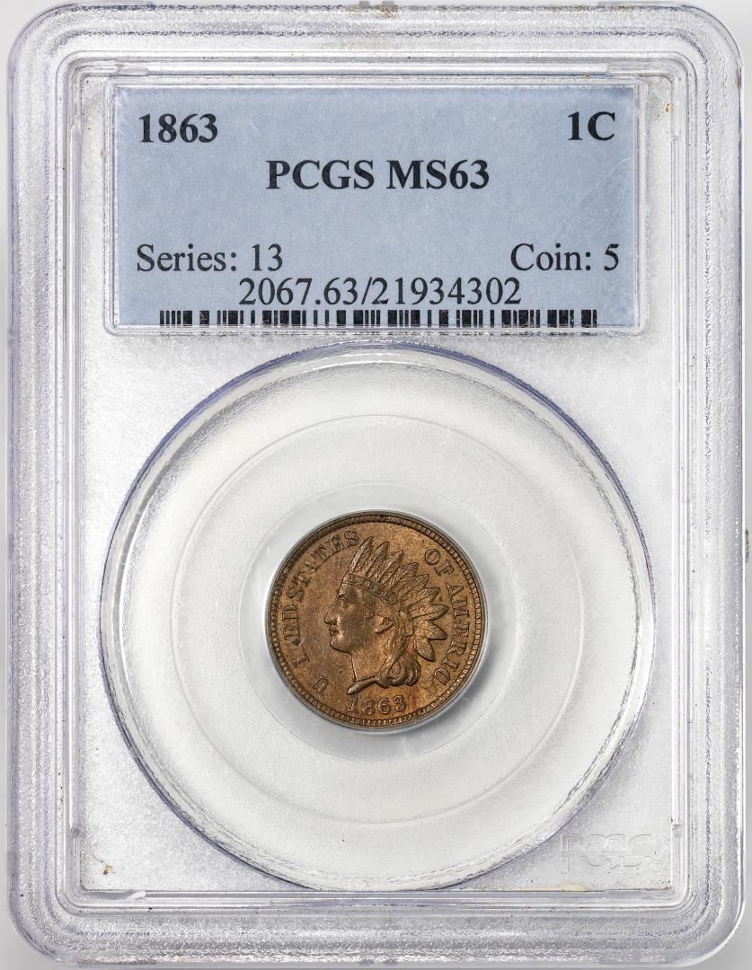 One 1863 Indian Head Cent Coin PCGS MS63. PCGS Graded.