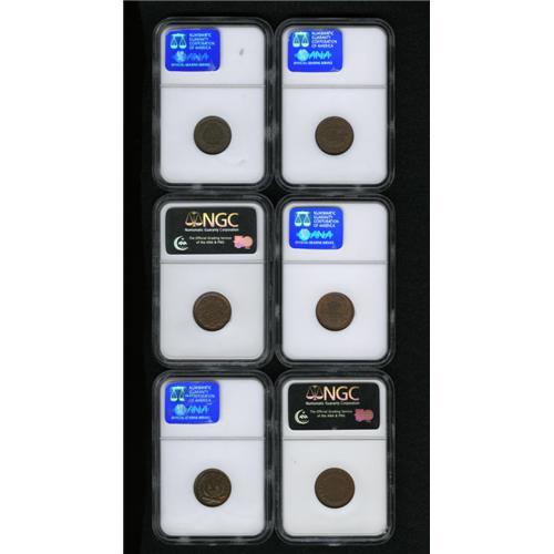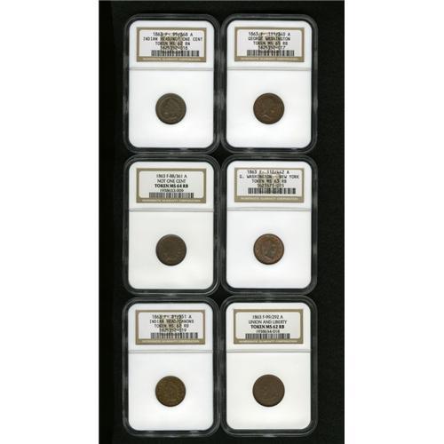 <B>1863 Indian Head/George Washington Patriotic Civil War Token Lot.</B></I> Each has an 1863-dated obverse with the Indian Head or George Washington motifs; a nice dealer lot or upgrade lot. Consists of: an <B>Indian Head/Cannons, Fuld-81/351A, R.1, MS62 Red and Brown NGC; Indian Head/Not One Cent, Fuld-88/361A, R.3, MS64 Red and Brown NGC; Indian Head/Not One Cent, Fuld-95/368A, R.2, MS62 Brown NGC; Indian Head/Union and Liberty, Fuld-99/292A, R.3, MS62 Red and Brown NGC; George Washington/New York, Fuld-110/442A, R.1, MS63 Red and Brown NGC;</B></I> and a <B>George Washington/Liberty Cap and Shield, Fuld-111/340A, MS65 Red and Brown NGC.</B></I> Current catalog value is approximately $250-$350.<BR><BR><b>Shipping:</b> Coins & Currency (<a target="_blank" href="http://www.heritageauctions.com/common/shipping.php">view shipping information</a>)