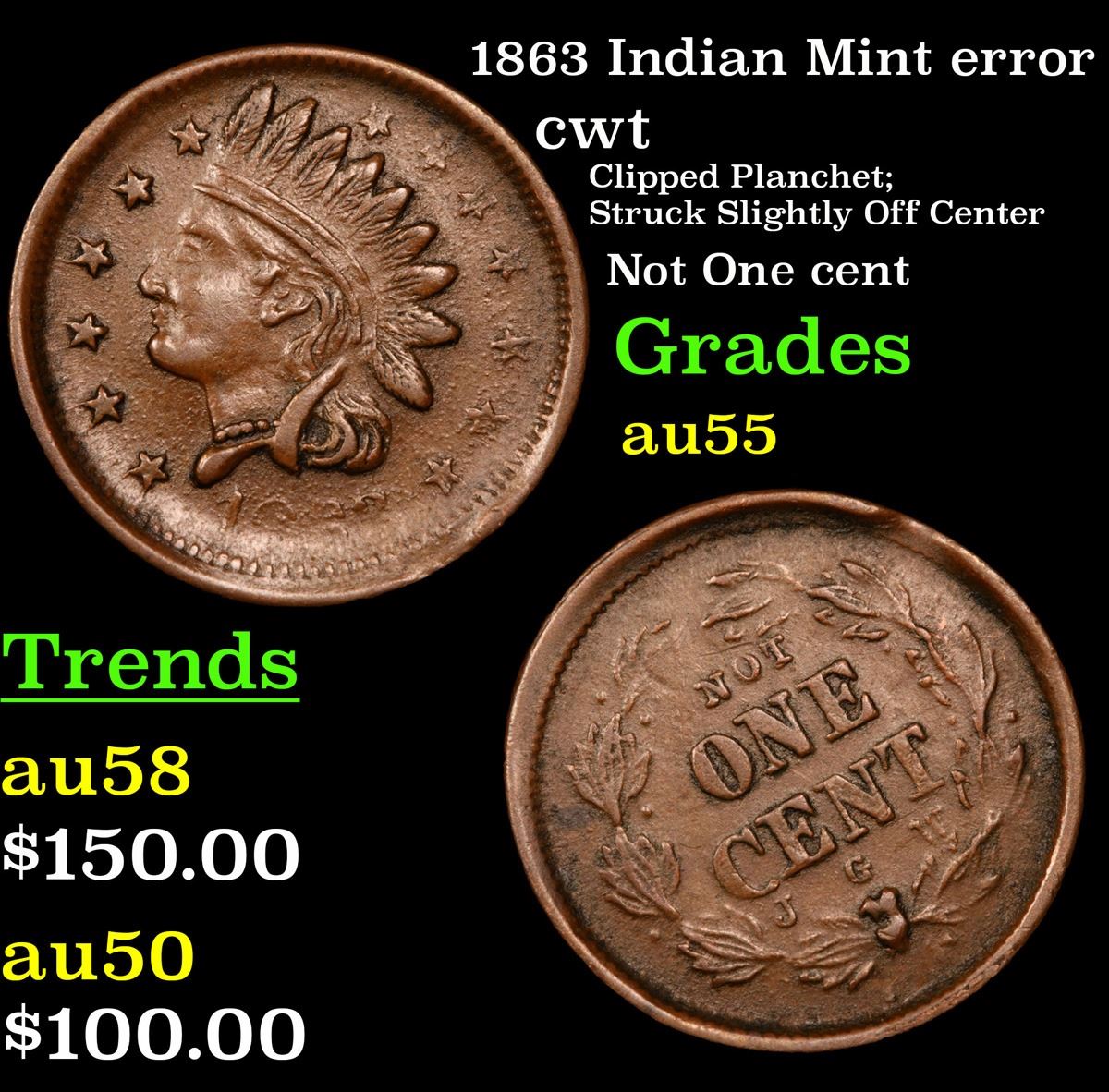 1863 Indian Mint error Civil War Token 1c Grades Choice AU.