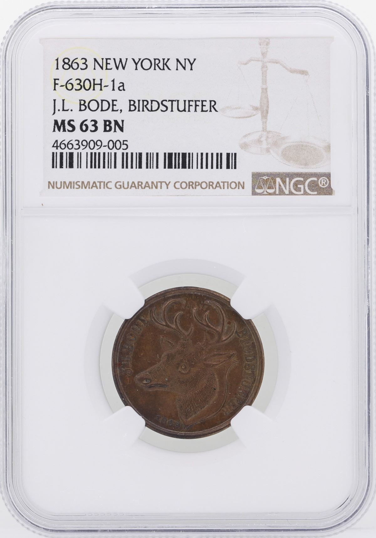 One 1863 J.L. Bode, Birdstuffer Civil War Token NGC MS63BN.
