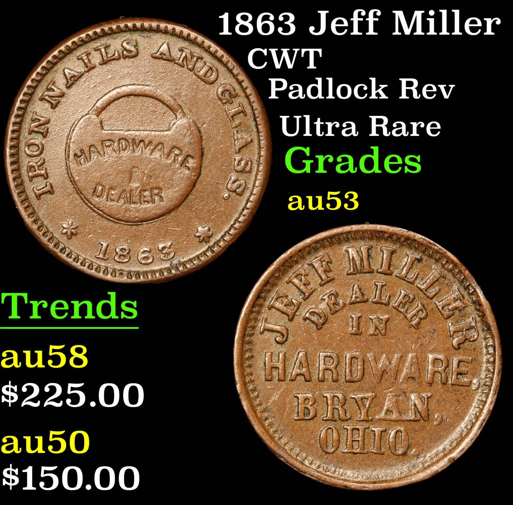 1863 Jeff Miller Civil War Token 1c Grades Select AU. Padlock Rev; Ultra Rare