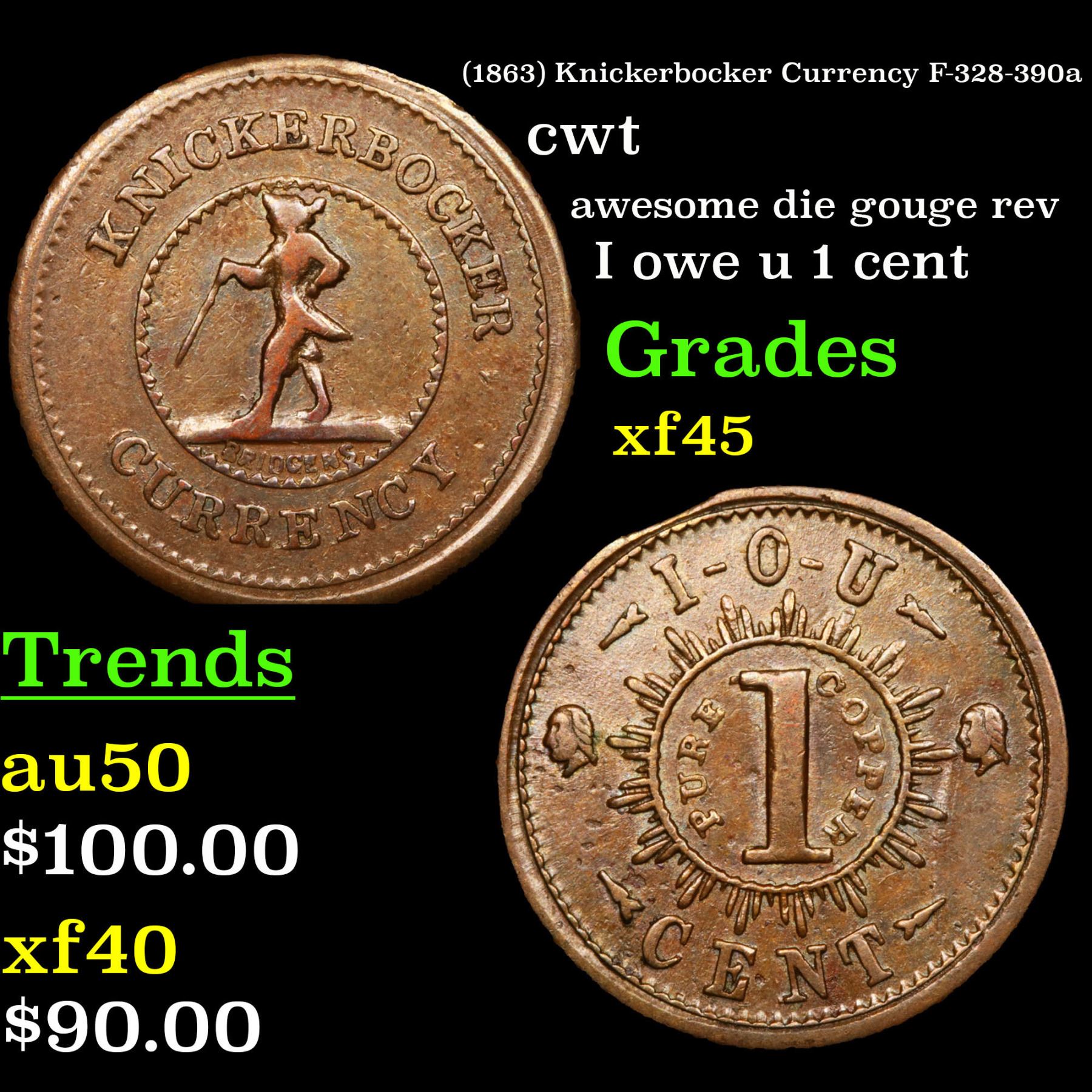 (1863) Knickerbocker Currency F-328-390a Civil War Token 1c Grades xf+.