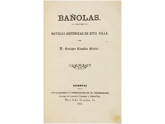 1863., LIBRO: (LOCAL-GIRONA-BANYOLES),. GIRAL, ENRIQUE CLAUDIO:, BAÑOLAS. NOTICIAS HISTÓRICAS DE ESTA VILLA., Gerona: Timp. Gerundense, 1863. 8º menor. 102 p. Enc. en plena piel, hierros dorados, contracantos, nervios, tejuelo, corte superior pintado, conserva las cubiertas originales. Palau 102636.