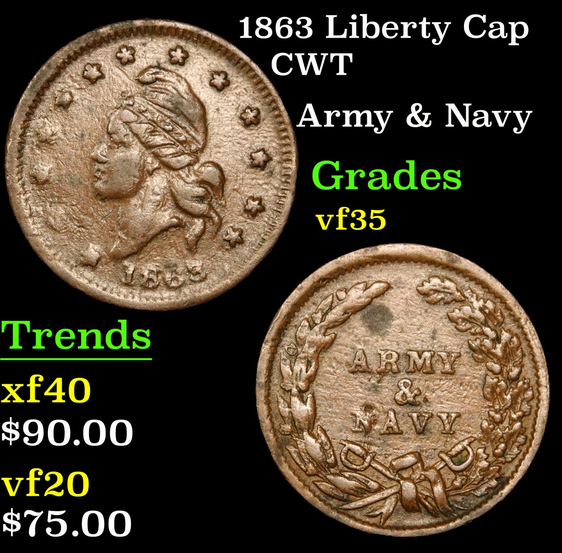 1863 Liberty Cap Army & Navy . Civil War Token 1c Grades vf++.
