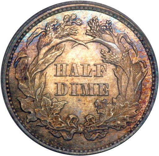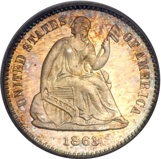 1863 Liberty Seated Half Dime. PCGS graded Proof 65. Light gold toning. Only 460 struck of this scarce Civil War date. Limited numbers survive at the Gem Proof 65 level and above: Pop 33; 11 finer (PCGS # 4446) .