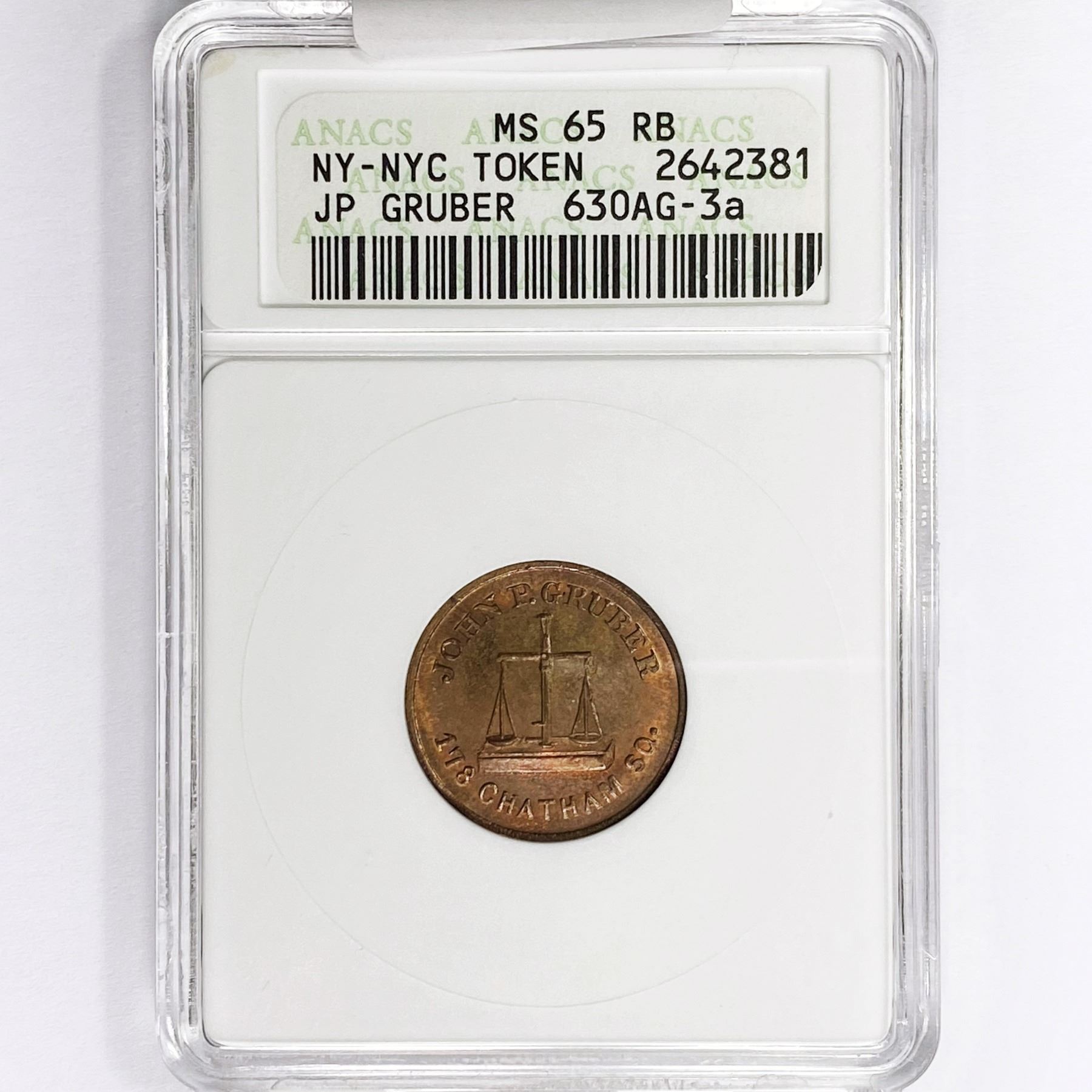 1863 NYC Token JP Gruber 630AG-3a ANACS MS65 RB