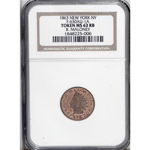 <B>1863 Maloney, Fuld-NY-630AU-1a, R.2, New York, NY, MS63 Red and Brown NGC.</B></I> Simply a super Civil War token, with more luster than would be expected from an MS63 Red and Brown. The R.2 rating is meaningless.