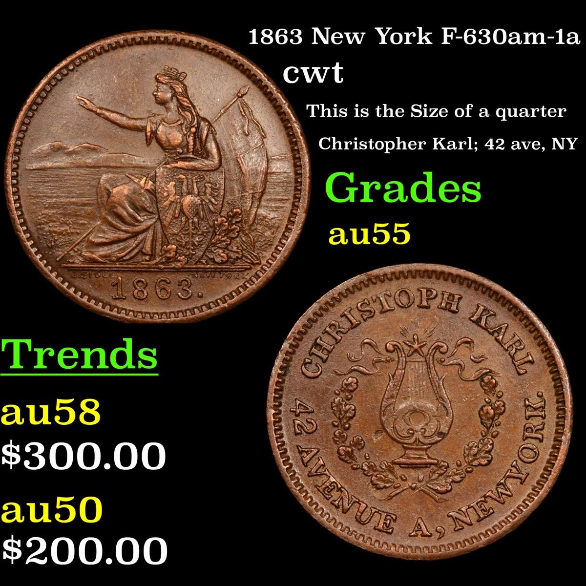 1863 New York F-630am-1a Civil War Token 1c Grades Choice AU. Due to the hoarding of hard currency during the Civil War, merchants issued tokens and store cards in lieu of coins for use in their stores. Most of those tokens included the name of the store and its merchandise right on the token. Other tokens were political in nature. However, this token gives only the name of the proprietor and the address of the business in New York City. After numerous Google searches I found two sources stating that Christoph Karl's business was either a liquor store or a saloon. I also found that Christoph Karl was born in Bavaria in 1824 and that he immigrated to the United States sometime between his birth in 1824 and 1859. In the following paragraphs, I will offer a theorem as to how and when Christoph Karl came to the United States using the allegory illustrated on this token.