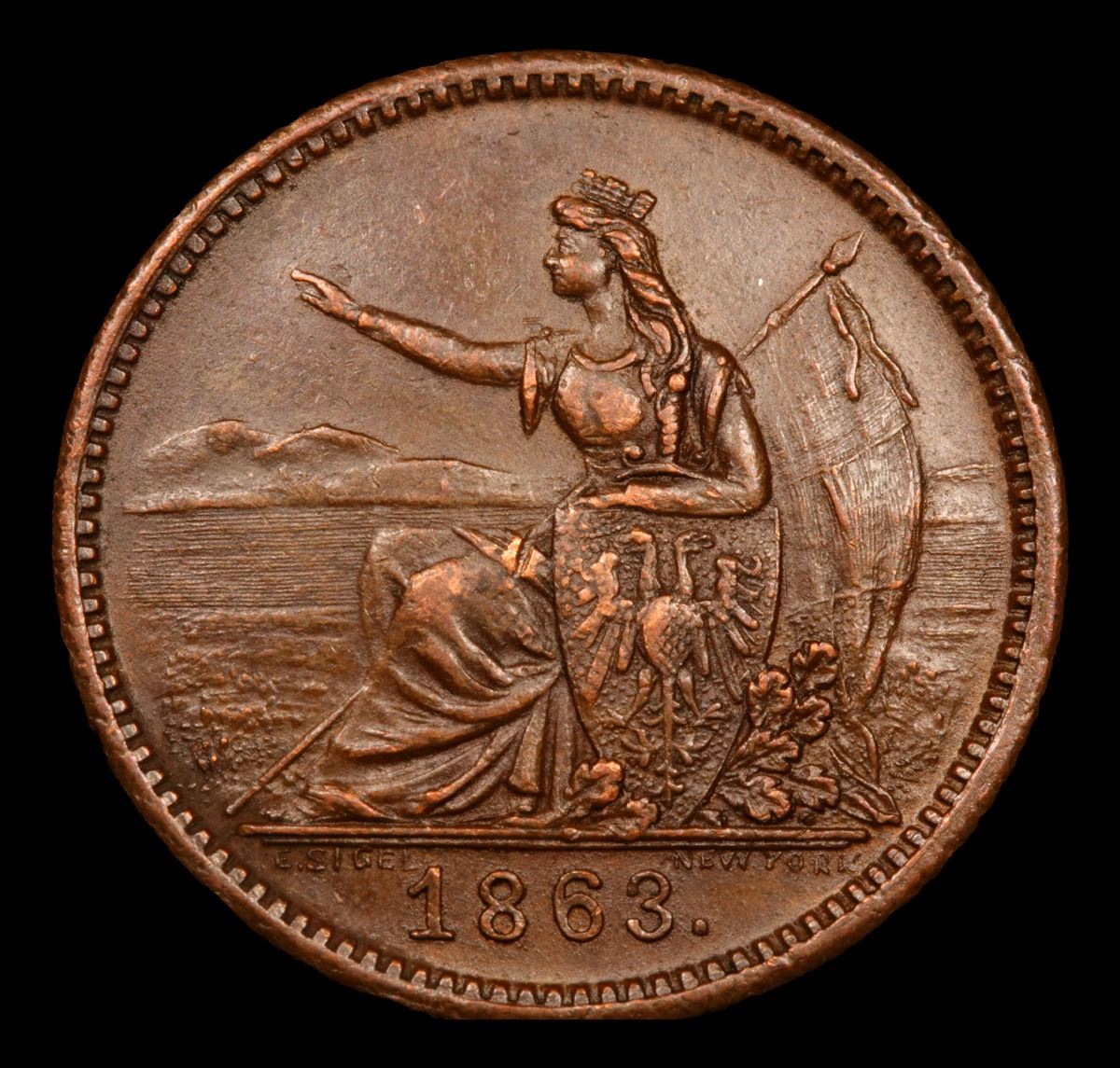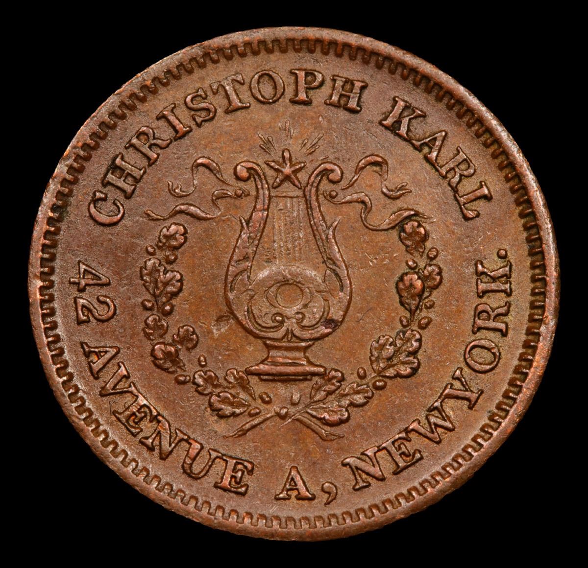 Not deterred by their earlier failures, I believe many of the Forty-Fighters took up the battle against the autocracies of Europe from their adopted homelands. Being a naturalized American citizen, Christoph Karl could now exercise his right to free speech without fear of reprisal. The lack of hard circulating currency during the Civil War was the perfect opportunity for a proprietor like Christoph Karl to continue to speak out against the reigning autocracies of the German states. Thus, I believe, given the absence of the business name on this token, that it should be numbered among those tokens making a political statement. Coins and tokens are excellent mediums in which to promote political causes. With the likelihood that a number of Germanic people and those sympathetic to the cause would frequent Christoph Karl's establishment, this token was likely effective in promoting the vision of an independent German state.