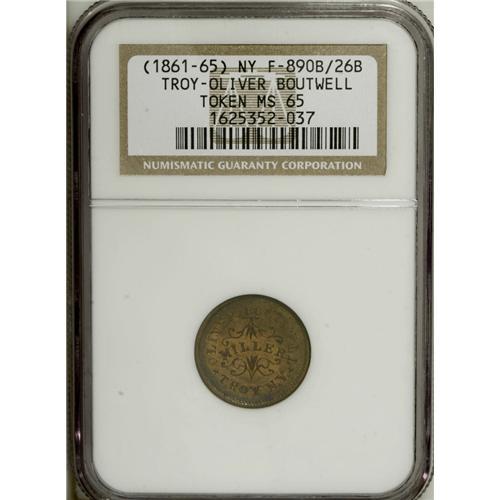 <B>1863 Oliver Boutwell, Miller, Fuld-NY-890B-26b, R.6, MS65 NGC.</B></I> Brass. A medium-scarce Civil War token from this prolific issuer. While the token has a dark-brass look to it, there are no noticeable flaws.<BR><BR><b>Shipping:</b> Coin/Currency (<a target="_blank" href="http://www.heritageauctions.com/common/shipping.php">view shipping information</a>)