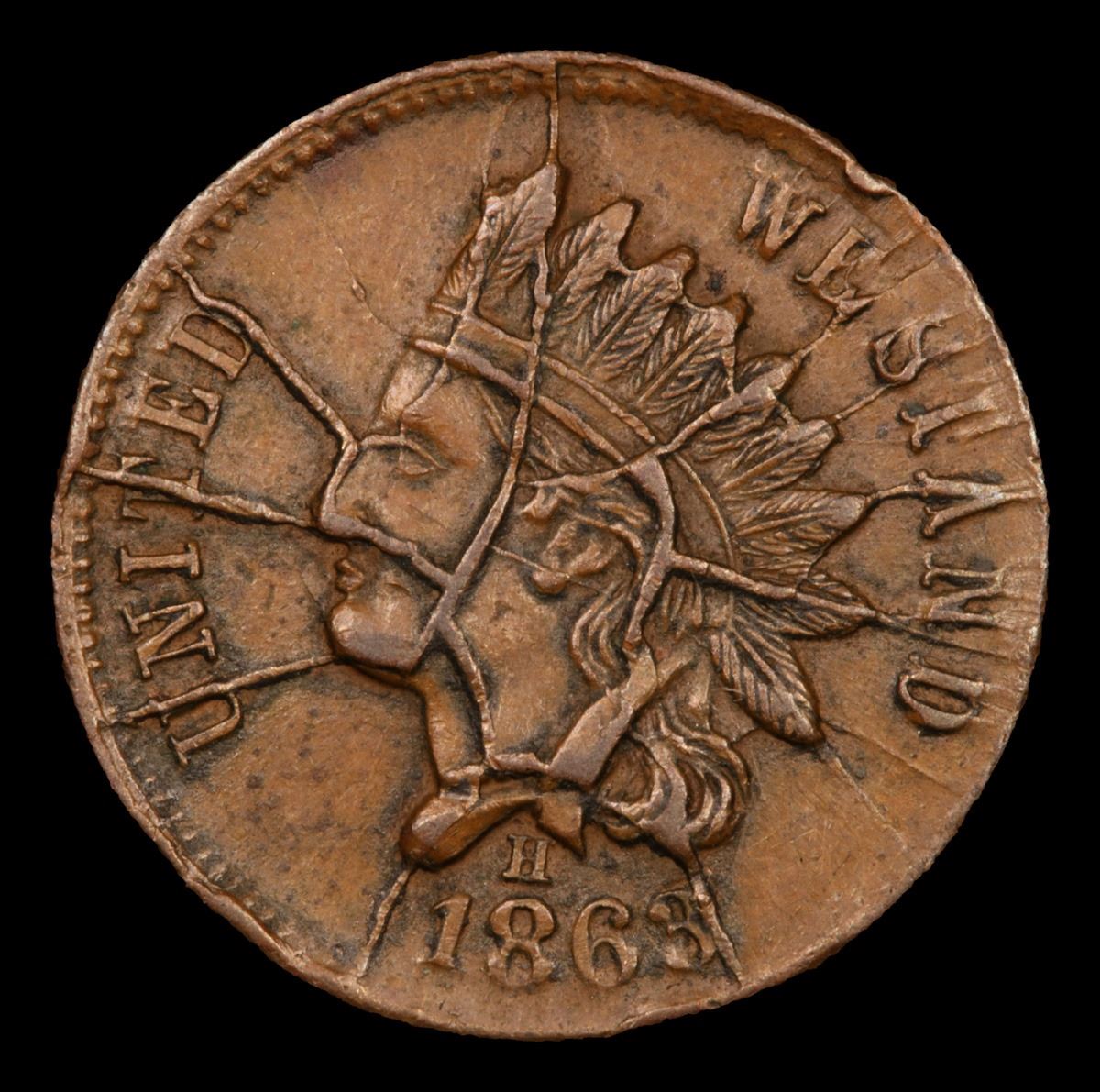 1863 One Country Civil War Token 1c Grades Select+ Unc BN. Incredible Coin. Up for Auction is the Spider Die Cracked Indian and ONE COUNTRY Broas Pie Bakers Reverse Civil War Token. Now while this great CWT has Four distinct varieties, (A) with No Spider Die Cracks, (B) with just the Indian Obverse with the Spider Die Cracks, (C) With the Spider Die Cracks on Both Obverse and Reverse, and finally (D) with the Perfect ONE COUNTRY Die matched up with the Spider Die Cracked ONE COUNTRY Die. This would be a sub variety, and a Wild one and one we have never brought to auction. It is the (B1) The Spider Die Cracks are only on the Indian Obverse, but the Reverse has a WILD Complete die clash of the entire Indian and the Full transfer of the Die Sinkers Initial H fully Transferred (H is for Horter). Incredible Coin. We have included a picture of the ONE COUNTRY Reverse as the third picture to illustrate the Indian as clear as possible, but the coin actually has a 45 degree CCW Rot Die as seen in Pic 2. A Superb Uncirculated Example of a Highly Sought Coin. A Corey's Pick, Bid to Win, Don't let it get Away, you might not find its equal Coin