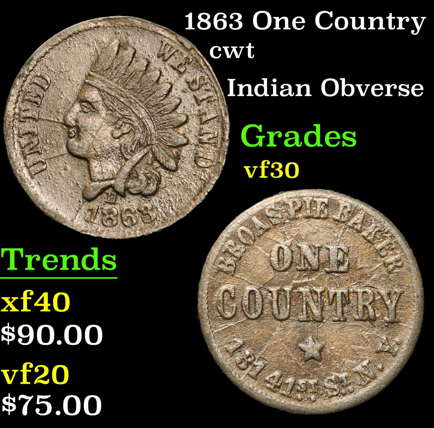 1863 One Country Civil War Token 1c Grades vf++. Indian Obverse; . A Corey's Pick, Bid to Win Coin