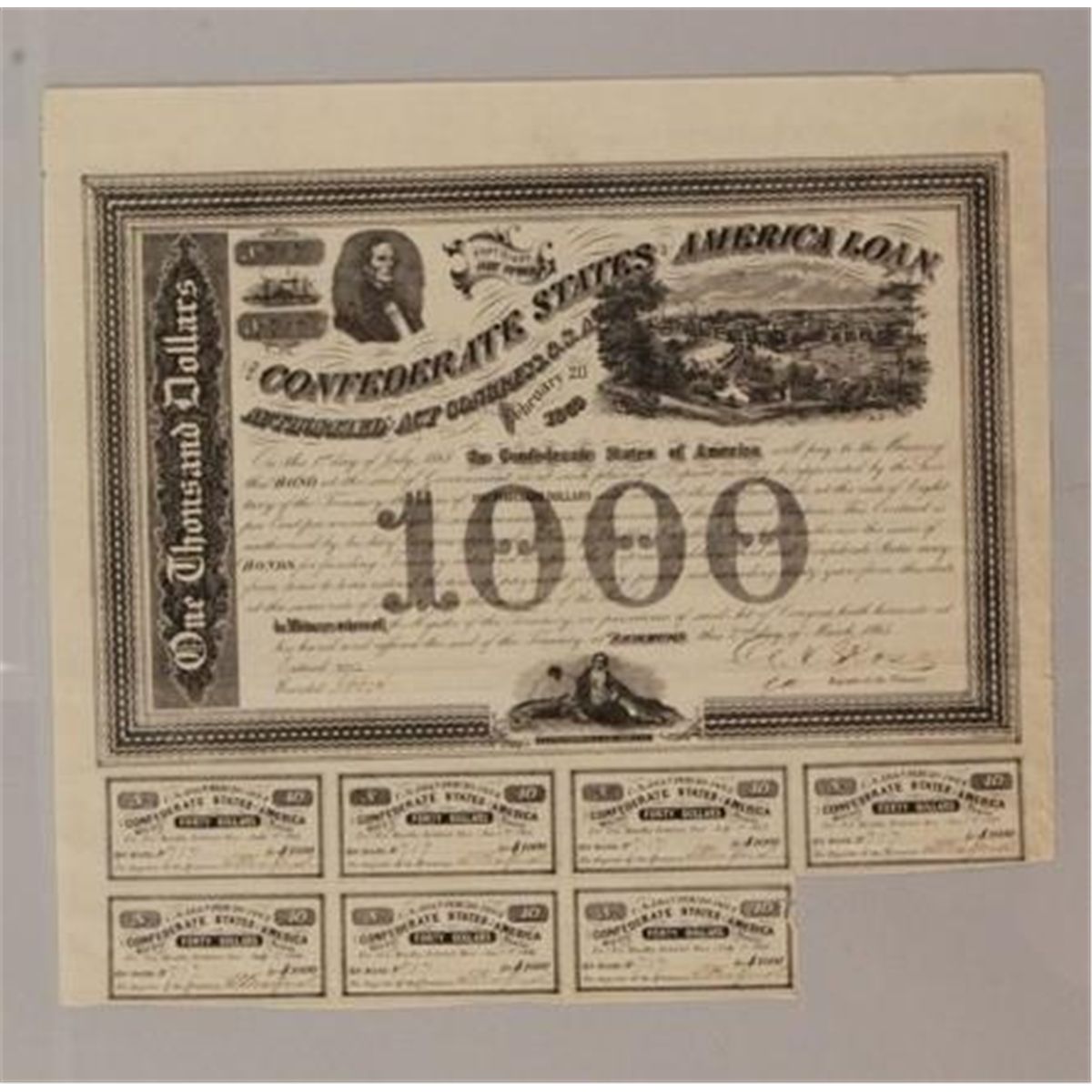 One thousand dollar eight percent CSA loan certificate, issued Richmond, 1863, no. 717. Large city vignette at right. Total of 7 $40 coupons attached. Overall good condition with light creasing, especially at edges, and toning. Blue stamp on back, Amsterdam 1865. 15in x 13 3/4in