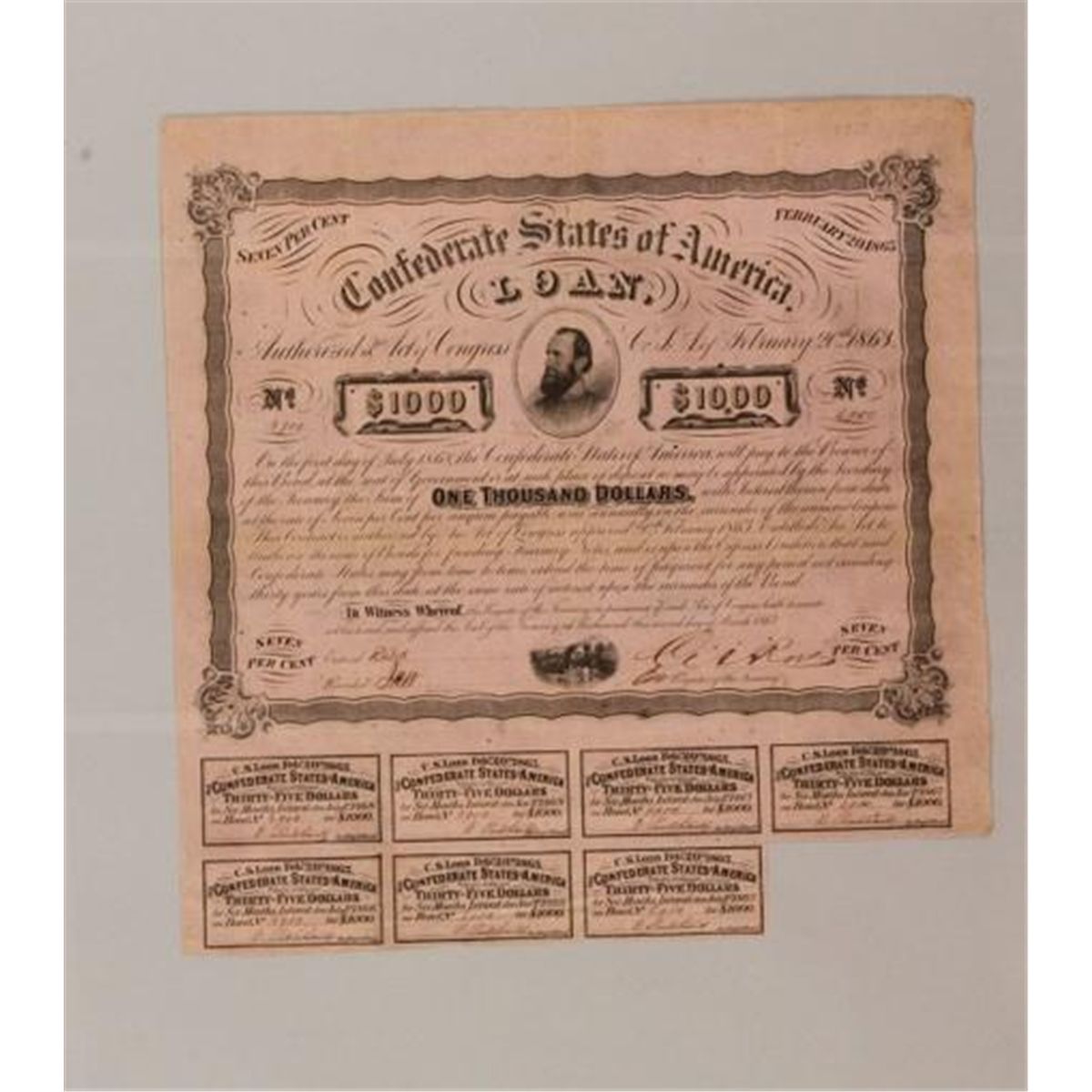 One thousand dollar eight percent CSA loan certificate, issued Richmond 1863, no. 4900. Total of 7 $35 coupons attached. Some creasing and scattered foxing. 13 3/4in x 14in.