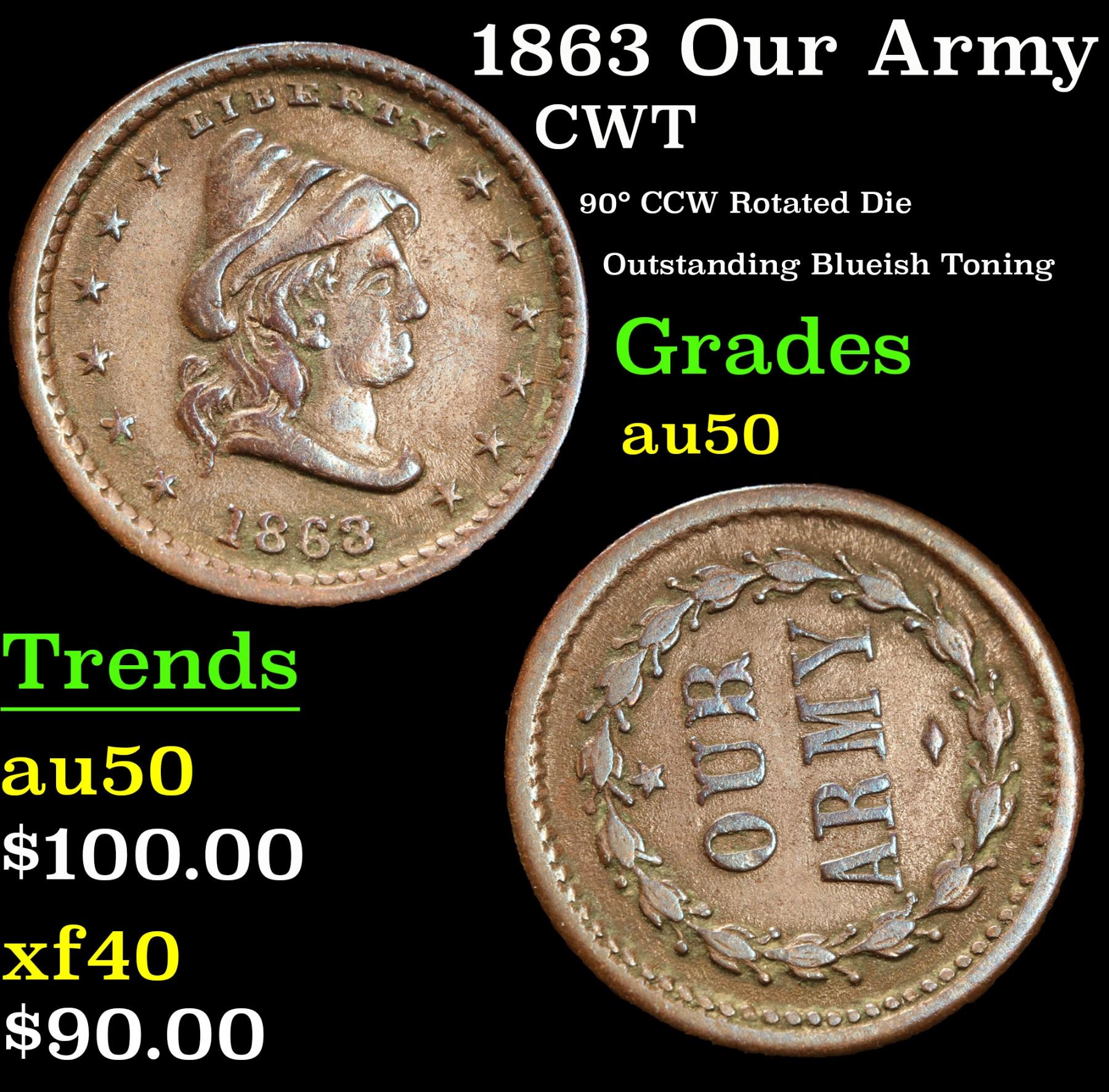 1863 Our Army 90¡ CCW Rotated Die Outstanding Blueish Toning Civil War Token 1c Grades AU, Almost Unc.