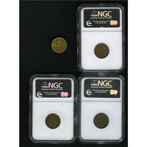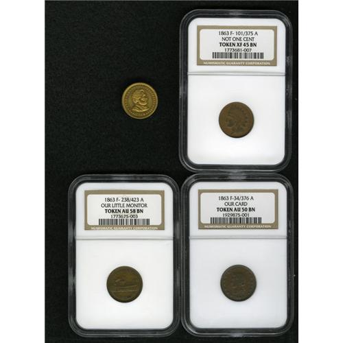 <B>1863 Our Card, Fuld-34/276a, R.8, AU50 NGC,</B></I> chocolate-brown patina, a few flecks of aqua debris, a minor curved clip (as made) at 10 o'clock, misattributed by NGC as F-34/376a; <B>1863 Not One Cent, Fuld-103/375a, R.4, XF45 NGC,</B></I> generally golden-brown with steel-gray on the highpoints, smooth surfaces, a typical strike, misattributed by NGC as F-101/375a; <B>1864 Lincoln and Union, Fuld-128/290, brass, R.4, AU50 Uncertified,</B></I> pleasing despite a few tiny carbon flecks, struck from clashed dies; and an <B>1863 Our Little Monitor, Fuld-237/423a, R.1, AU58 NGC,</B></I> a sharp chocolate-brown example, minor build-up within the legends, misattributed by NGC as F-238/423a.<BR><I>From The Troy Wiseman Collection.</B></I>