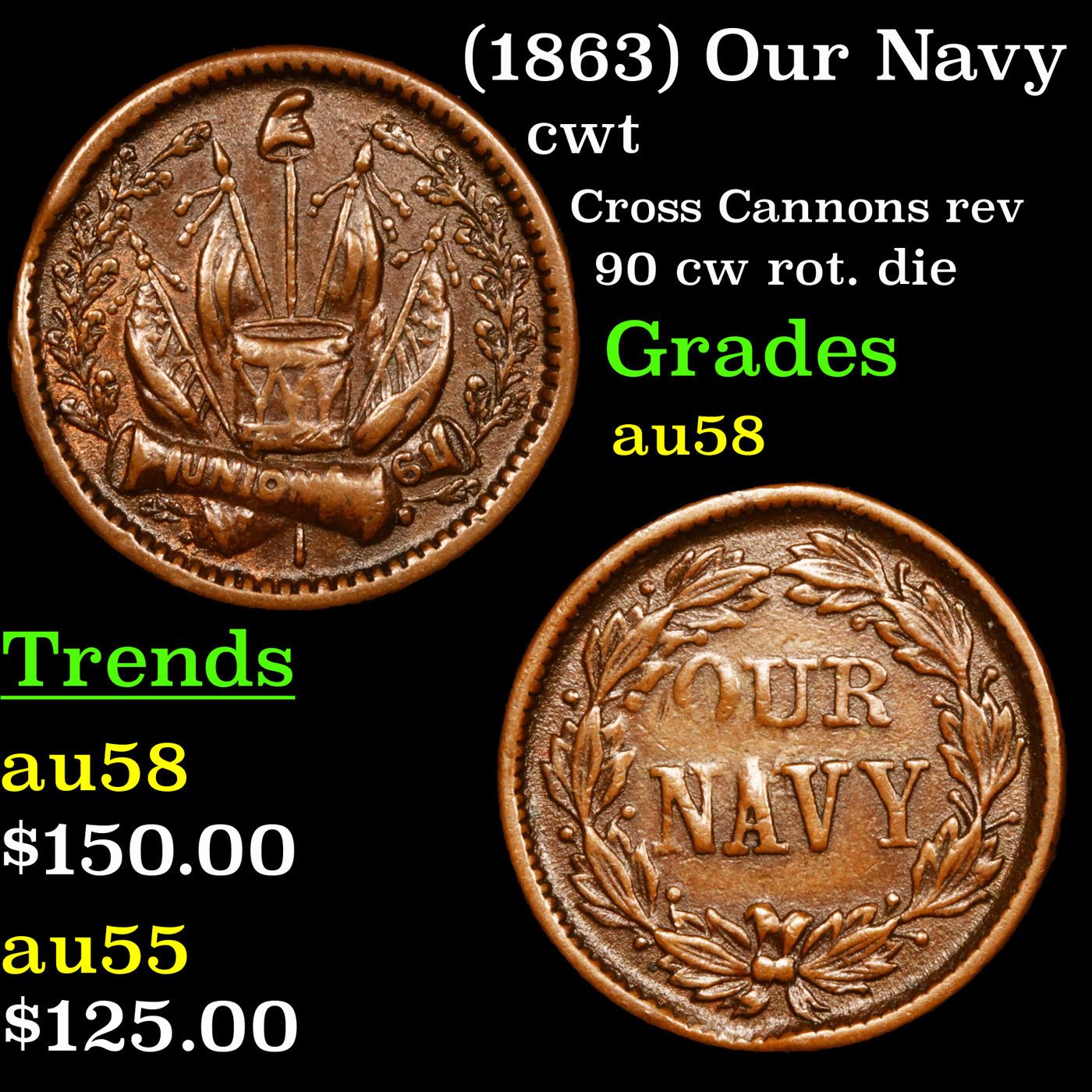 (1863) Our Navy Civil War Token 1c Grades Choice AU/BU Slider.