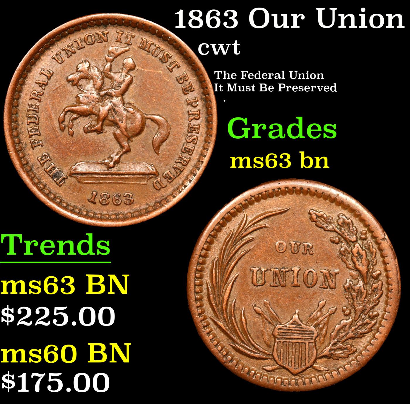 1863 Our Union Civil War Token 1c Grades Select Unc BN.