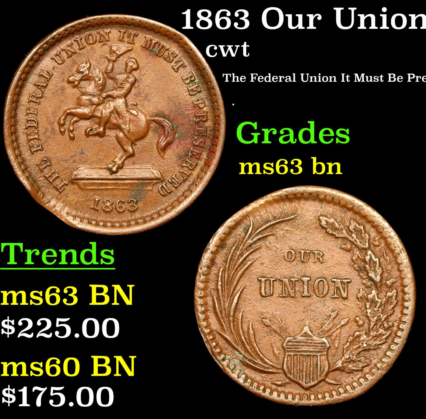 1863 Our Union F-178/267a Civil War Token 1c Grades Select Unc BN.