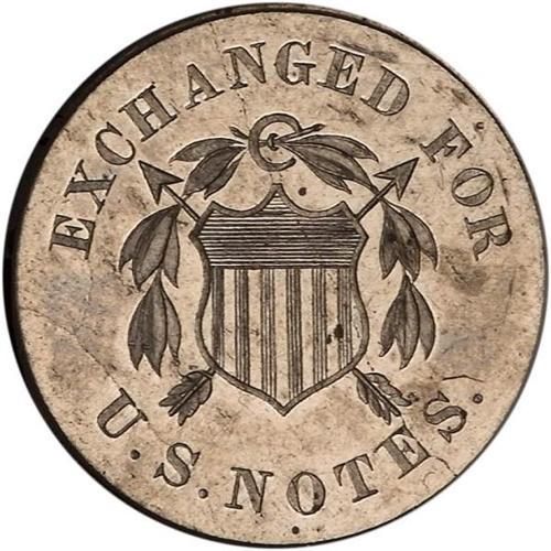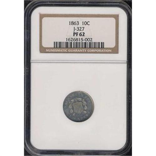 <b>1863 Pattern Dime. Aluminum, plain edge. Judd-327. Pollock-397. NGC graded Proof 62.</b> The satin-like aluminum-gray luster is almost unimpaired by abrasions or hairlines of any size although we do detect a few consistent with its Proof 62 grade. Given the proper amount of strike pressure, the coin was fully brought up by the dies. This was a Pattern coin conceived to be circulated in place of the Postage Currency then in use, hence its legend EXCHANGED FOR U.S. NOTES <b>(PCGS # 60486)</b>