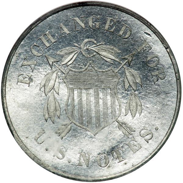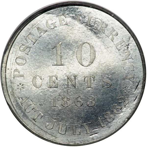 1863 Pattern Dime. Aluminum, plain edge. Judd-327. Pollock-397. High Rarity 6. PCGS graded Proof 64. Free from spots. Gleaming and silvery fresh in color. These were proposed to replace the Fractional Currency paper money with a subsidiary or token coinage. Pop 6; 1 in 65 (PCGS # 60486) .