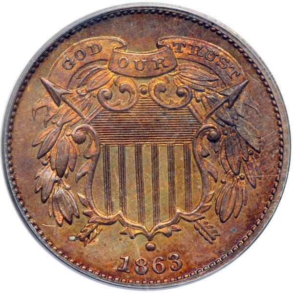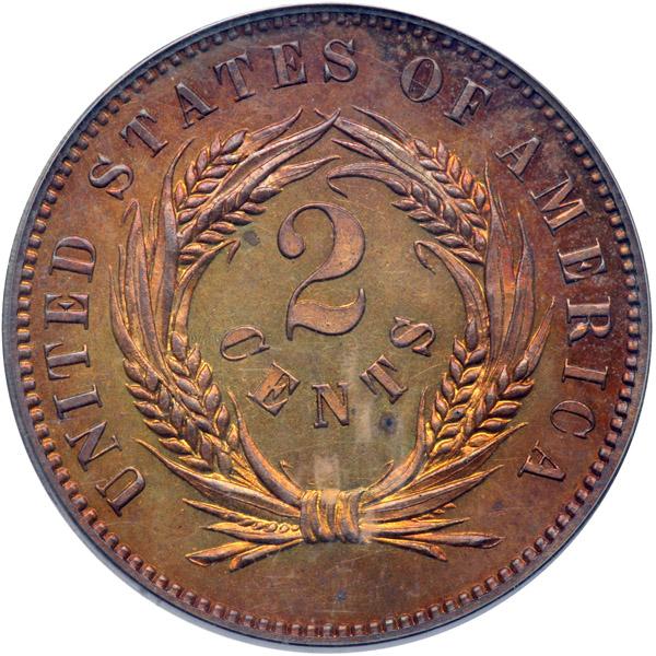 1863 Pattern Two Cents. Bronze, plain edge. Judd-312. Pollock-377. Rarity 4. PCGS graded Proof 64 Red & Brown. Lovely sunset golden colors, surfaces tend to be dullish on some J-312 Patterns but this isn't the case here, the coin is gleaming. In an OGH. Pop 20; 14 in 65 RB (PCGS # 70467) .