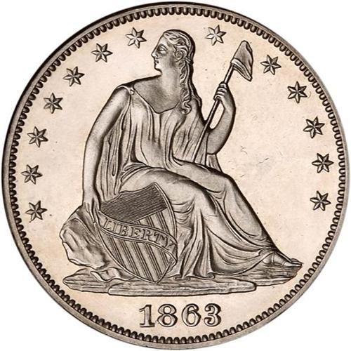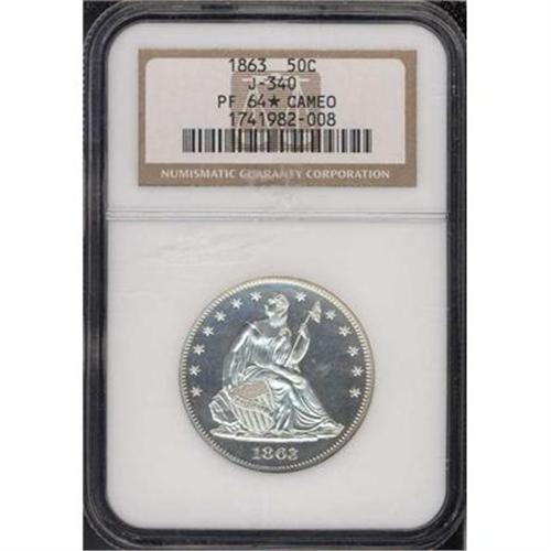 <b>1863 Pattern Half Dollar. Silver, reeded edge. J-340. P-412. NGC graded PF64 CAM Star Designation for Eye Appeal.</b> The desirable GOD OUR TRUST pattern proposal uses the regular obverse die to strike the Proofs of 1863, married to a reverse that was similar to the regular die but the motto is on a scroll above the eagle. Lustrous and glittering with full bright mirrors surrounding crisp white cameo devices. Untoned and dazzling because of it. Endless eye appeal on this one! <b>(PCGS # 60502)</b> <i>