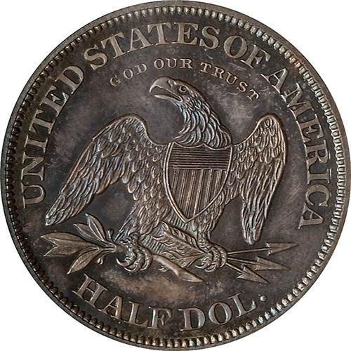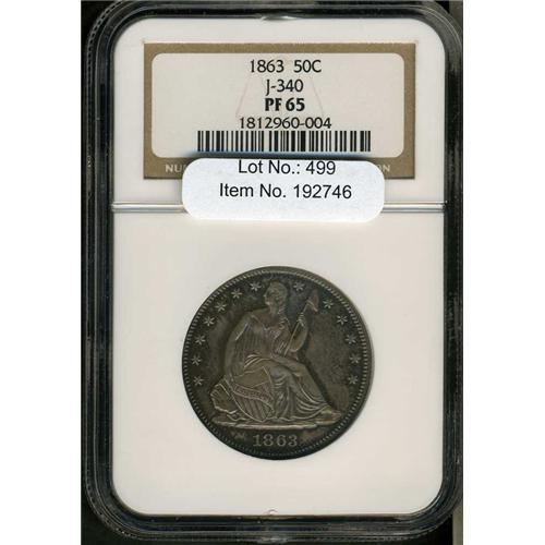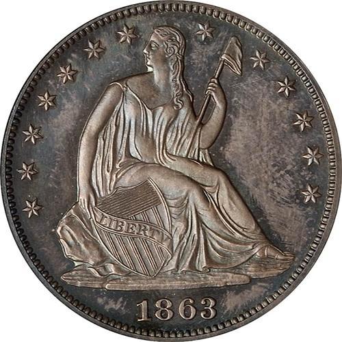 Judd 340 1863 Half Dollar Regular dies but with a different motto. From a population of about eighteen. A lower grade example sold three years ago for $4600.