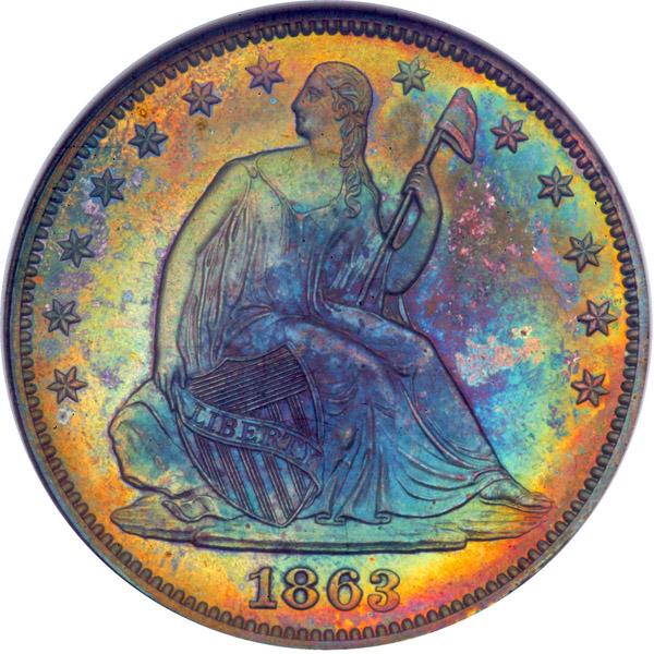 1863 Pattern Half Dollar. Copper Reeded Edge. Judd-341. Pollock-413 Rarity 5. ANACS graded Proof 64 Red & Brown. Struck in copper. Lovely green and gold toning, the surfaces gleaming with originality, the colors bright, vibrant, almost effervescent. Design with GOD OUR TRUST unadorned in the field above the eagle (the other main Pattern type has the motto inscribed on a simple scroll).