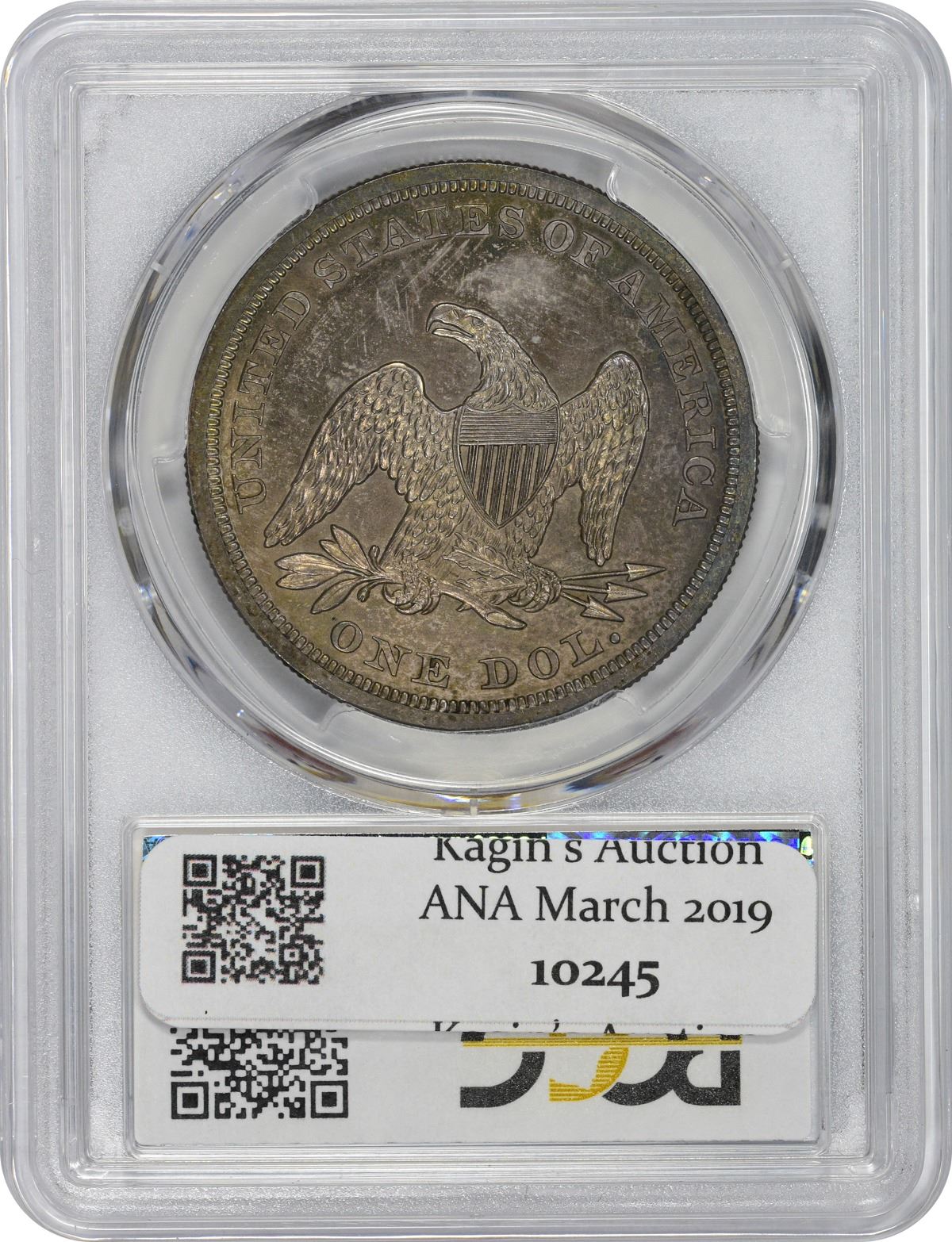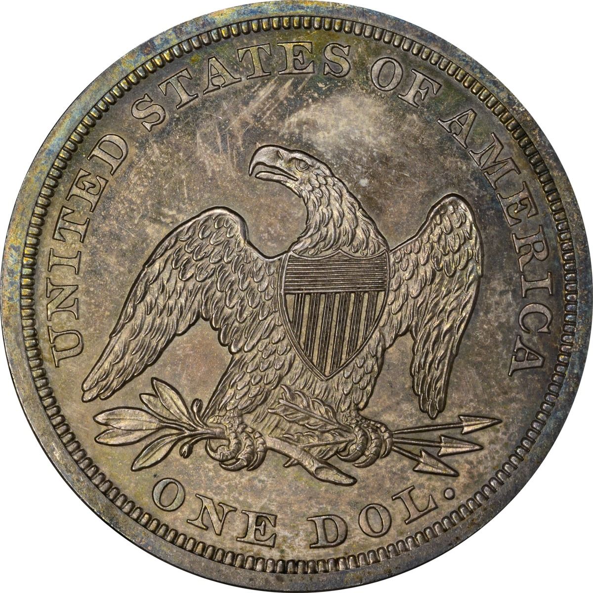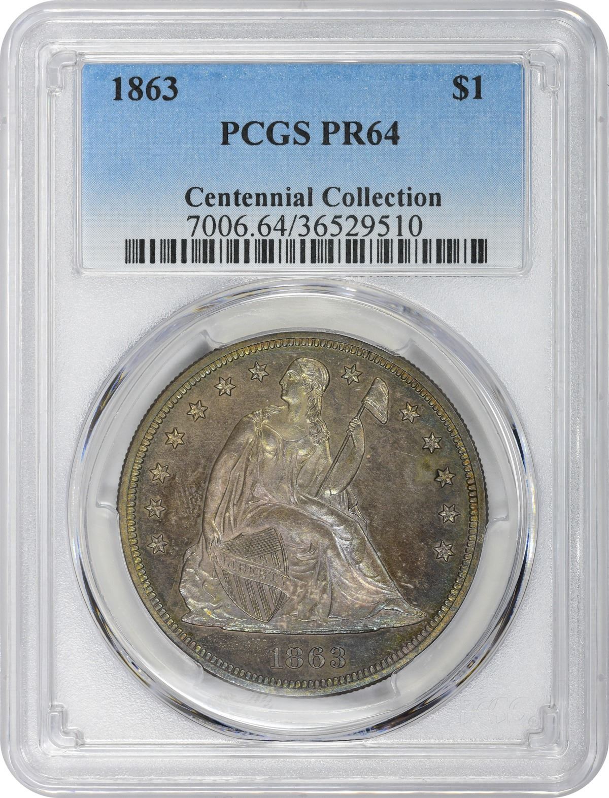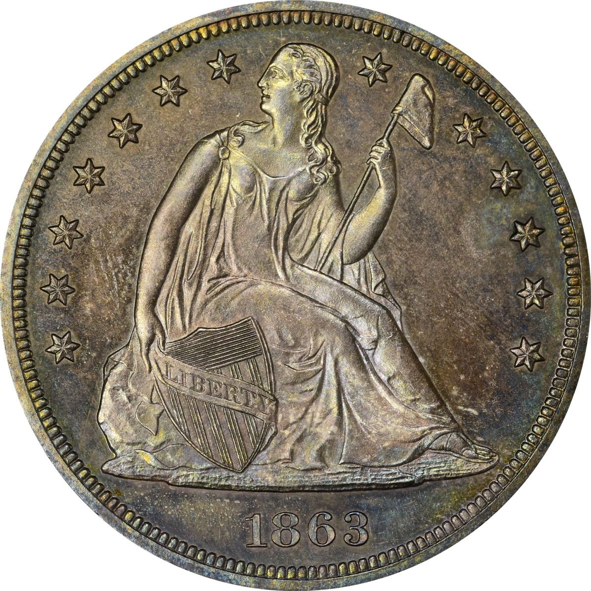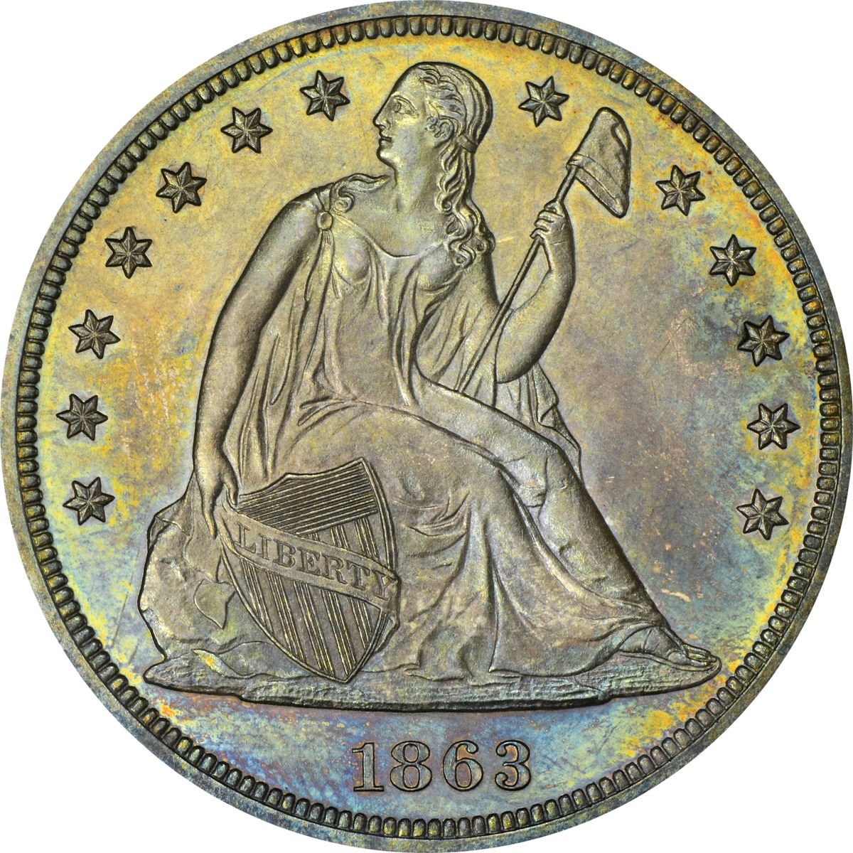 Here is a smoky gray near-gem struck at the height of the Civil War, one of 460 pieces struck in the Proof format. Pale peach-gold and electric blue iridescence comes to life in a bright light, highlighting the boldly rendered design motifs and the reflective fields. Of interest to those who study such things: a pair of raised diagonal die lines can be seen in the lower loop of the 8 in the date and the reverses arrows are separated. Choice, scarce, and attractive, and definitely a win for its next steward. PCGS #7006