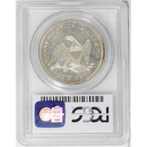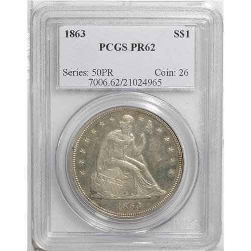 <B>1863<img border='0' src='http://www.heritagecoins.com/images/star.gif' width=10 height=10>$1> PR62 PCGS.</B></I> Fully struck with impressive details throughout, and lovely gold, apricot, and gray toning that is attractively intermingled on both sides. The piece is free of contact marks, but wispy hairlines are noted in the fields.