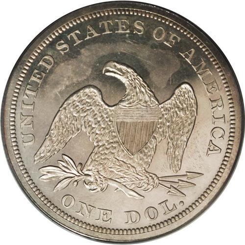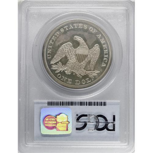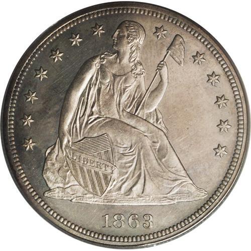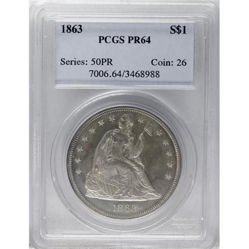 <B>1863 S$1 PR64 PCGS.</B></I> This low mintage Civil War proof silver dollar has pale aqua-blue and cream toning with a blush of pink-rose across the upper reverse field. Careful study locates a few trivial hairlines. Just 460 proofs were struck. Population: 36 in 64, 11 finer (2/07).<BR><BR><b>Shipping:</b> Coins & Currency (<a target="_blank" href="http://www.heritageauctions.com/common/shipping.php">view shipping information</a>)