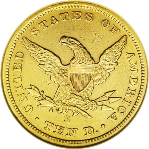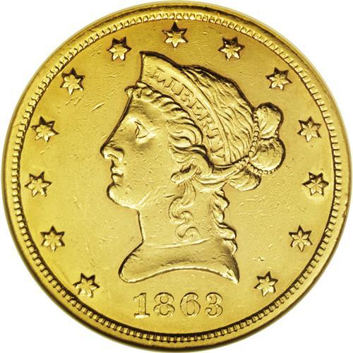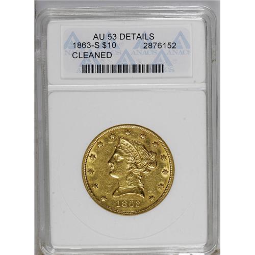 <B>1863-S<$10>--Cleaned--ANACS. AU53 Details.</B></I> A true scarcity in the No Motto series of eagles, both in an absolute sense as well as in terms of condition rarity. Just 10,000 pieces were struck during the height of the Civil War, with perhaps fewer than one percent of those surviving today, most in well circulated grades. Although showing minimal wear, this example is liberally hairlined and unnaturally bright after its unfortunate numismatic abuse.