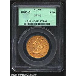 1863-S $10 XF40 PCGS.<p>The '63-S is an absolute as well as a condition rarity among No Motto Tens with an original mintage of only 10,000 pieces. It is extremely rare in XF condition and only a handful of coins are known in better grades. Well defined in the centers, there is a bit of striking softness on the peripheral stars. The surfaces have a dull reddish patina overall and there are no obvious or distracting abrasions on either side. Important notice: We expect to be auctioning lots at the rate of 200-250 per hour. Sometimes eBay Premier live bid software cannot keep up with that pace, so we strongly recommend that you place a realistic proxy bid now as insurance to avoid disappointment. Also please note that all Heritage/CAA lots purchased through eBay Premier carry a 20% Buyer's Premium.