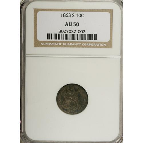 <B>1863-S 10C AU50 NGC.</B></I> Autumn-brown and jade-green alternate across this deeply toned but partly lustrous scarce date dime. Although 157,500 pieces were struck, most spent years of service in the West Coast economy, and NGC has certified fewer than a dozen in Mint State (4/07).<BR><BR><b>Shipping:</b> Coins & Currency (<a target="_blank" href="http://www.heritageauctions.com/common/shipping.php">view shipping information</a>)