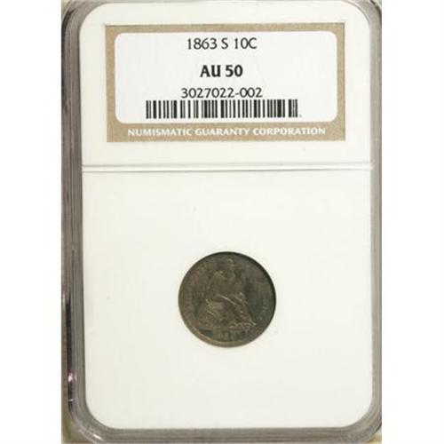 <B>1863-S 10C AU50 NGC.</B></I> NGC Census: (1/19). PCGS Population (2/12). Mintage: 157,500. Numismedia Wsl. Price for NGC/PCGS coin in AU50: $450. (#4638)<BR><BR><B>Coin Engraver:</B> Christian Gobrecht<BR><BR><b>Shipping:</b> Coins & Currency (<a target="_blank" href="http://www.heritageauctions.com/common/shipping.php">view shipping information</a>)