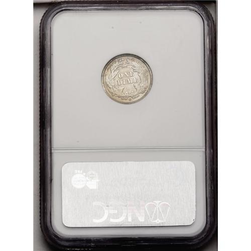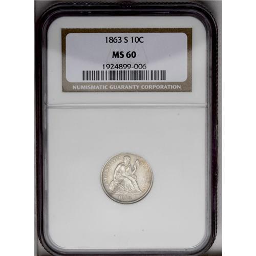 <B>1863-S<10C> MS60 NGC.</B></I> Wisps of light tan and faded electric-blue patination are concentrated in the peripheral areas of this sharply struck S-Mint issue. Remnants of a diagonal grease streak and associated planchet roughness are visible on the shield. Some small contact marks are noted in the obverse fields. A conditionally rare Civil War issue; Gerry Fortin and Brian Greer list the 1863-S as Low R.7 in Mint State.