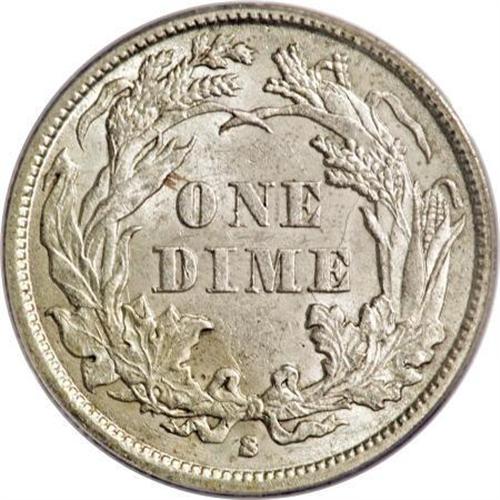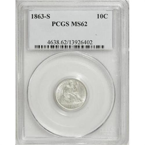 <B>1863-S 10C MS62 PCGS.</B></I> The 1863-S is rarely seen in Uncirculated grades, even though 157,500 pieces were produced. This is a bright, satiny example that is sharply defined on each side. There are a number of small abrasions scattered over each side, but none that are individually significant. Population: 3 in 62, 6 finer (8/07).<BR><BR><B>Coin Engraver:</B> Christian Gobrecht<BR><BR><b>Shipping:</b> Coins & Currency (<a target="_blank" href="http://www.heritageauctions.com/common/shipping.php">view shipping information</a>)