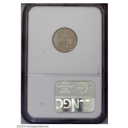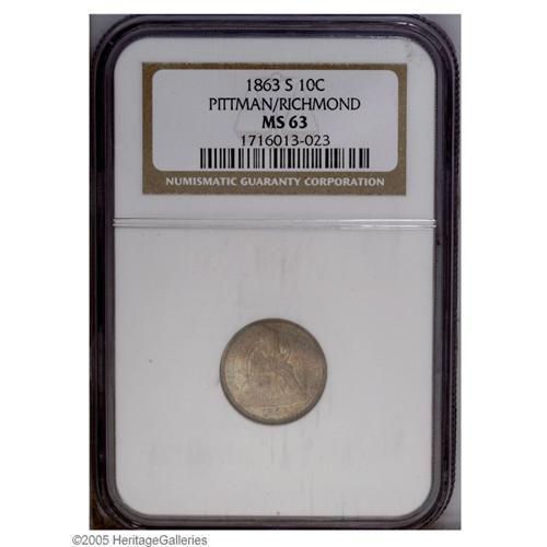 <B>1863-S<10C> MS63 NGC.</B></I> Ex: Pittman/Richmond. While the '63-S is very tough above VF, it is actually elusive in all grades. Our records show that, since 1973, the 1863-S has made 21 auction appearances in grades Good 4 through MS66 in major sales. Similarly, as of October 2005, NGC and PCGS combined have certified only 35 pieces in all grades. This MS63 specimen is well defined on the design elements. The silver-gray surfaces display a splash of rose on the obverse, and exhibit a few minor handling marks on the lower reverse. This is a rare opportunity for the Seated dime specialist. Population: 4 in 63, 4 finer (10/05).