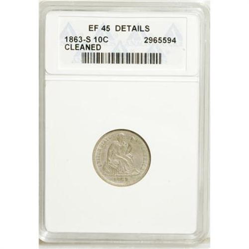 <B>1863-S 10C --Cleaned--ANACS. XF45 Details.</B></I> NGC Census: (3/21). PCGS Population (1/14). Mintage: 157,500. Numismedia Wsl. Price for NGC/PCGS coin in XF45: $255. (#4638)<BR><BR><B>Coin Engraver:</B> Christian Gobrecht<BR><BR><b>Shipping:</b> Coins & Currency (<a target="_blank" href="http://www.heritageauctions.com/common/shipping.php">view shipping information</a>)