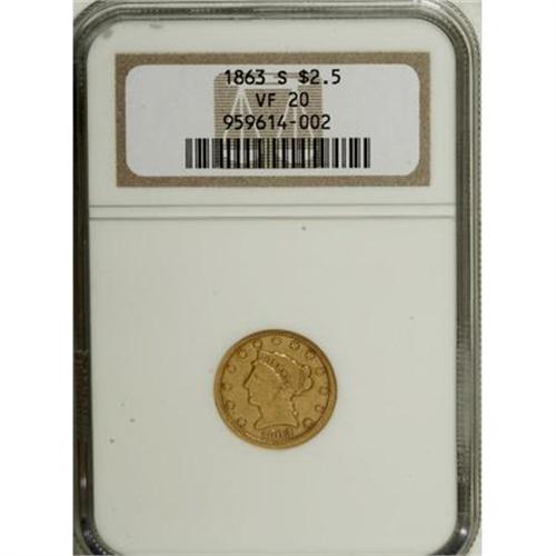<B>1863-S $2 1/2 VF20 NGC.</B></I> NGC Census: (2/62). PCGS Population (4/26). Mintage: 10,800. Numismedia Wsl. Price for NGC/PCGS coin in VF20: $450. (#7799)<BR><BR><b>Shipping:</b> Coins & Currency (<a target="_blank" href="http://www.heritageauctions.com/common/shipping.php">view shipping information</a>)